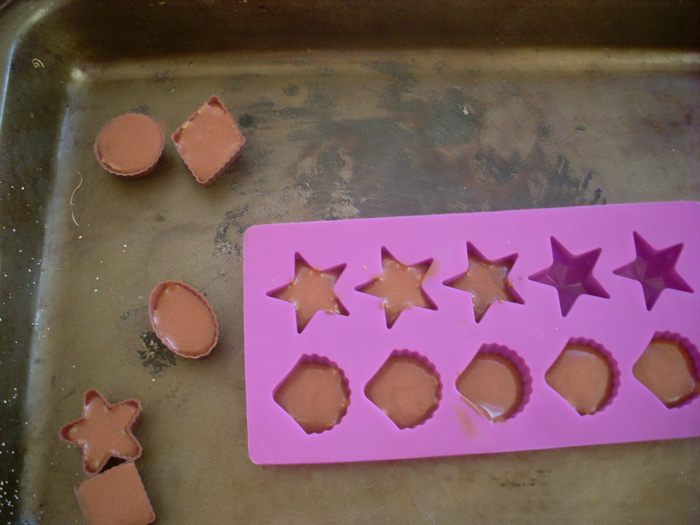 Заморозить в морозилке или на балконе часов на 10 до полной твердости. Вынуть из формочек. Хранить в морозилке, при комнатной температуре они тают.
