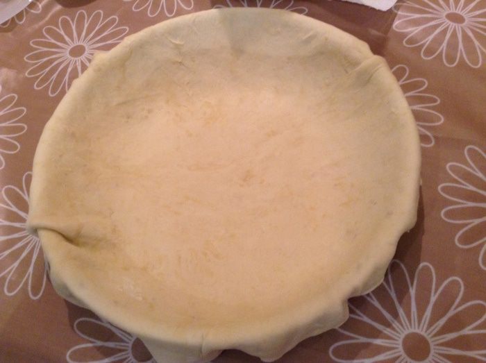 Раскатать тесто и выложить в форму (28см), края должны свешиваться.
