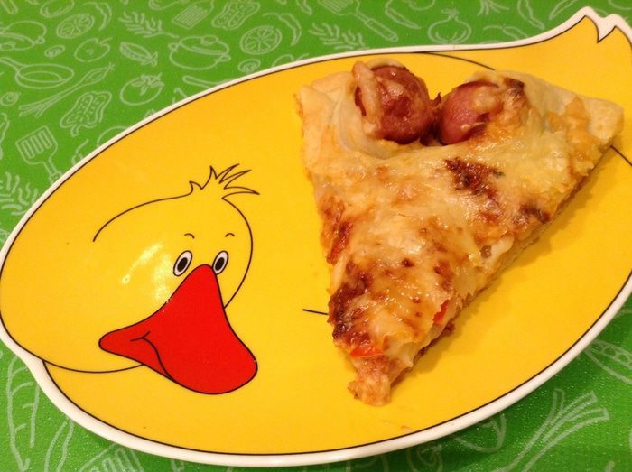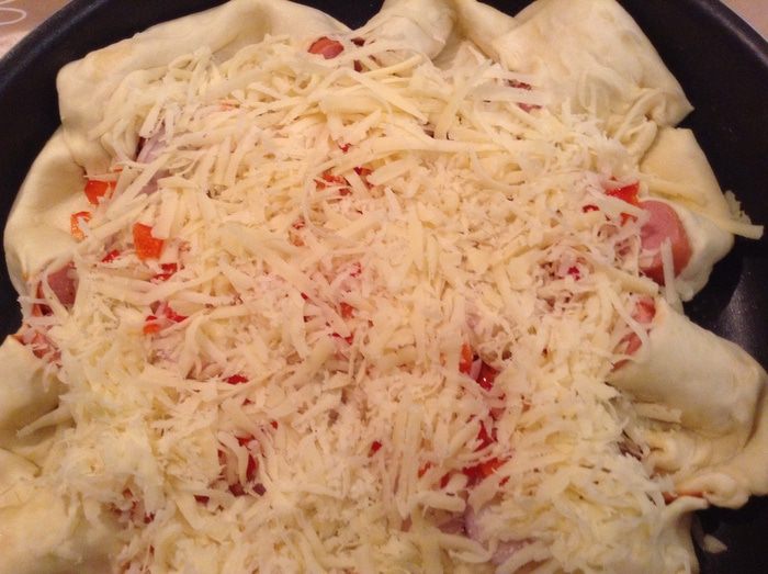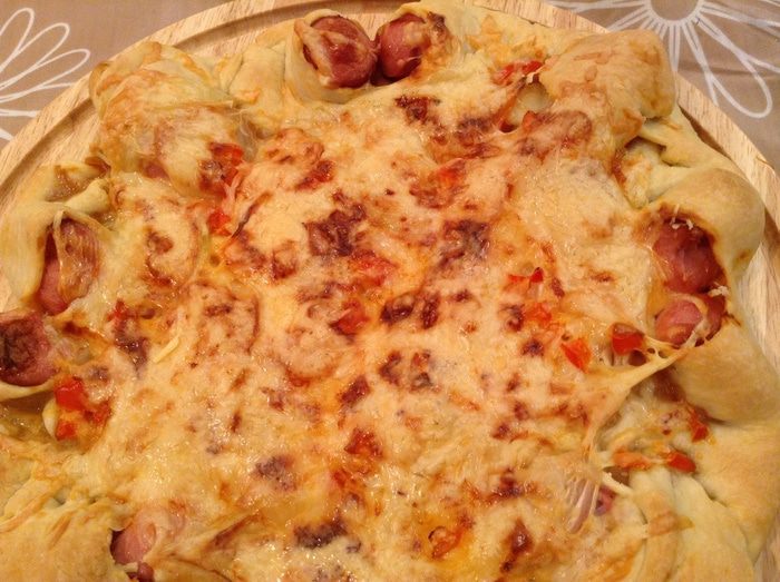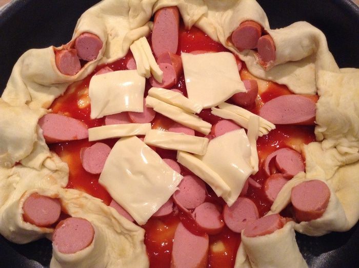 Смазать основы томатным соусом. Выложить сосиски.