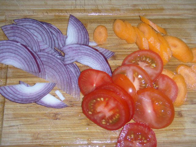 Лук порезать небольшими скибками, помидор и морковь кружечками, лосось разделать на сегменты,