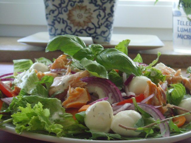 Все составляющие салата выложить на салатный микс, добавить бамбини - моцареллу, полить оставшейся заправкой и украсить веточкой базилика.