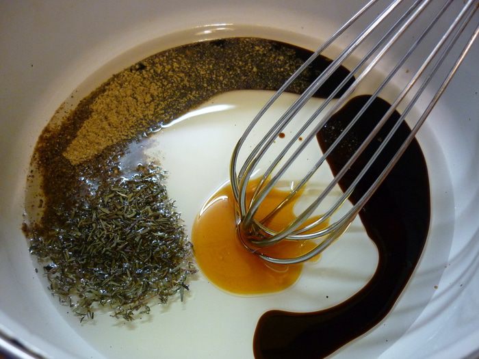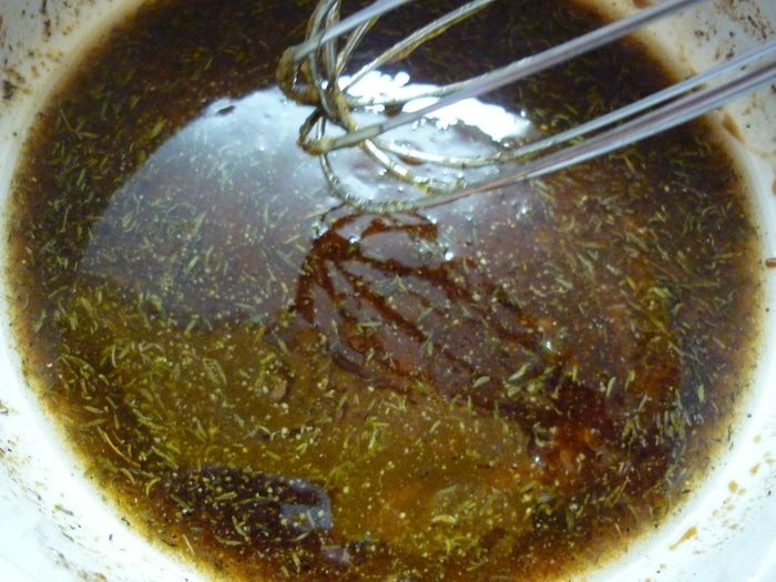 Соус маринад: смешиваем масло, соевый соус, соль, мед, перец и тимьян в посуде, в которой рыба будет мариноваться.