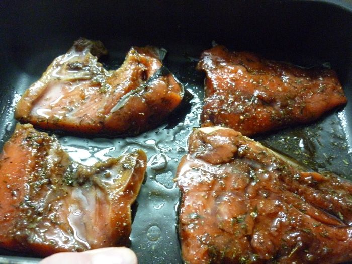 Выкладываем отдохнувшую рыбу на противень шкуркой вниз, сверху польем маринадом. И в духовку. ли под гриль минут на 20.