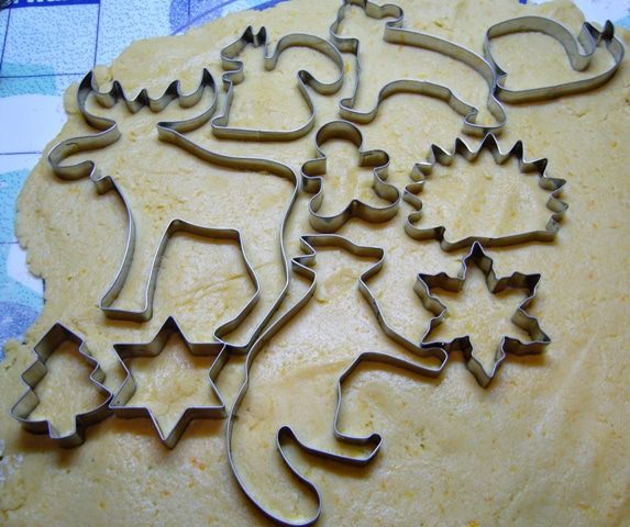 Для того, чтобы повесить готовые печенюшки на елку, сделать в них отверстия. Я это сделала палочкой для суши. Причем отверстие нужно делать побольше, т. к. при выпечке оно уменьшается.