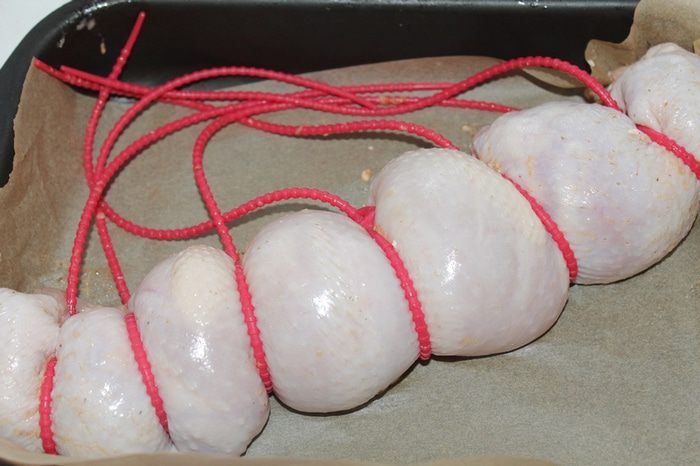Скрепляем жгутиками (или нитями) и оставляем где-то на час, чтобы курица пропиталась соусом..