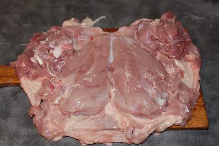 Затем срезаем часть мяса и равномерно распределяем по распластанной бескостной куриной тушке. Слегка отбиваем.