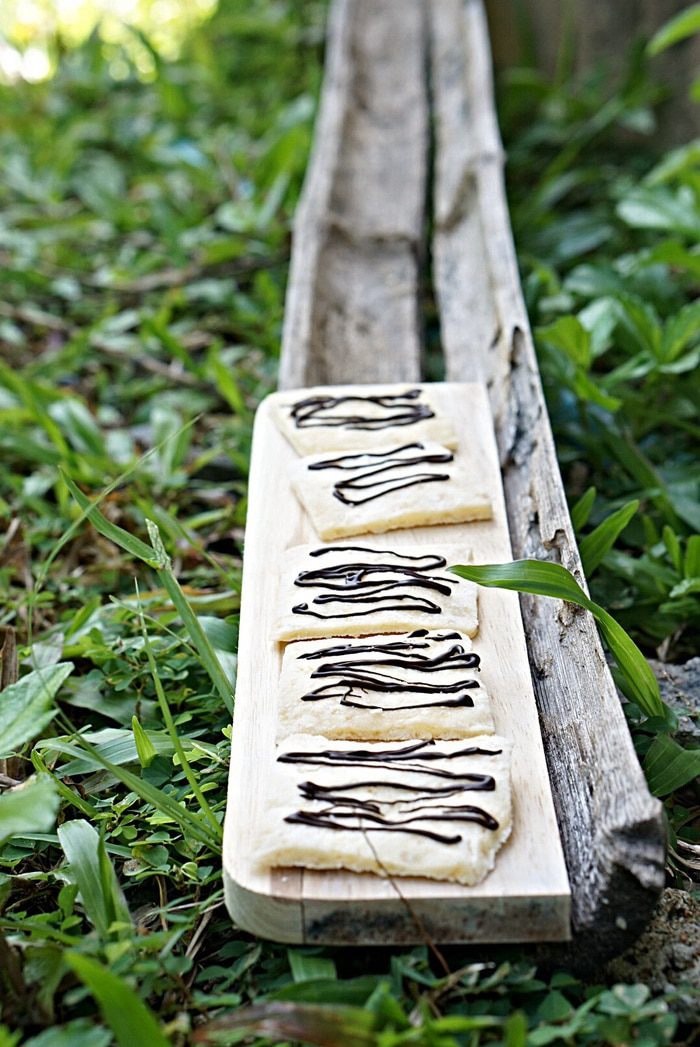Отрезать в пакете уголок и нанести полоски шоколада на печенье. Охладить 20 минут в холодильнике.