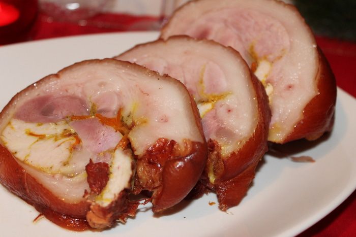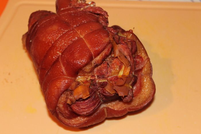 Берем кастрюлю побольше, кладем туда рульку, заливаем нашим маринадом. Кладем столовую ложку соли, ставим на огонь. Я варила 1,30 час на медленном огне, мне было достаточно, но вы смотрите, может понадобится и дольше. Если надо доливаем воду во время варки. Готовую рульку протыкаем острым ножом аккуратно, если выйдет чистый сок, то она готова.