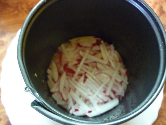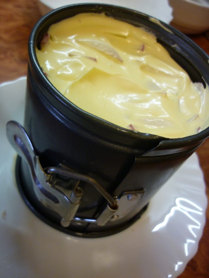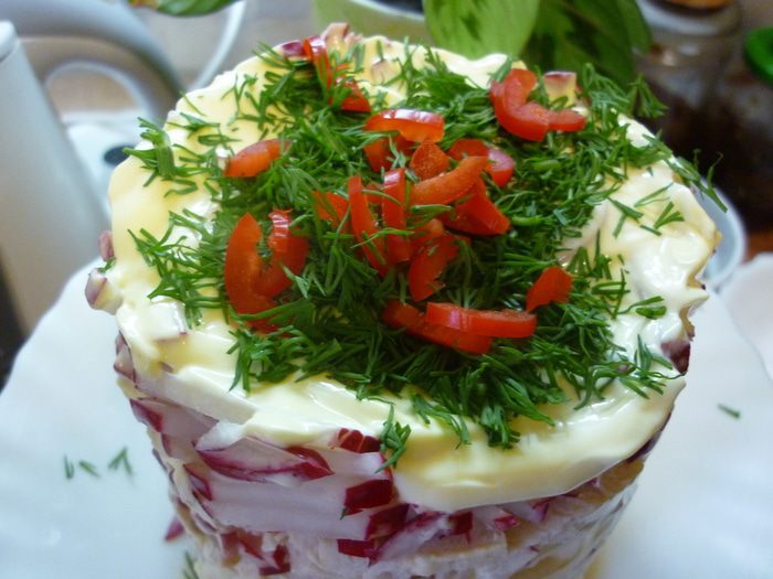 Для меня этот салат очень торжественный, поэтому я достала разъемную форму, она маленькая, ок 10 см в диаметре. Но больше и не нужно. Форму на тарелочку приземлим. предварительно изнутри немного маслом растительным смажем. Форму лучше поставить вверх ногами. По низу ведь идет желобок для донышка, который потом может помешать аккуратно удалить ее.