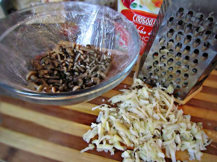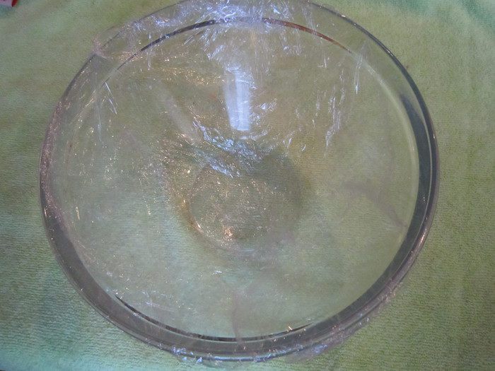 Выбрать салатницу круглой формы. Покрыть её пищевой плёнкой и немного смазать растительным маслом.