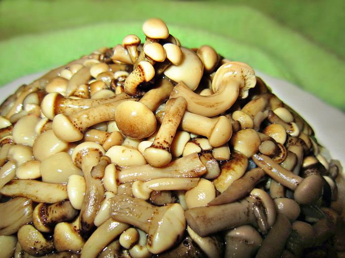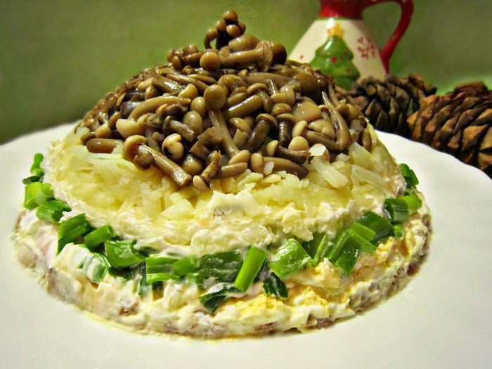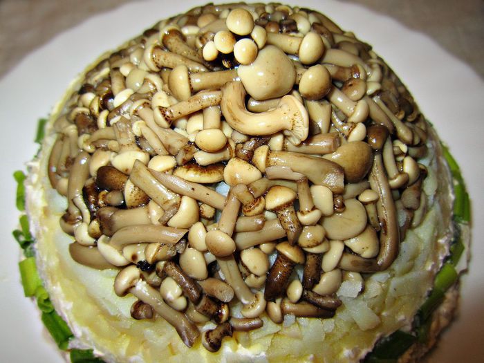 Очень вкусный зимний салатик! Готовила его уже на Новый год! Всем очень понравился! Но поскольку во время праздничного торжества разошёлся салат так быстро, что покушать "от души" успели не все, решила повторить его ещё раз. Грибочки в салате я использовала свои - в конце лета с мужем удачно сходили в лес прогуляться и "напали" на поляны, усыпанные опятами. Такое количество малюсеньких грибочков я никогда не видела! Глаза разбежались! Потрудились мы на славу - все перебрали-помыли, а потом и замариновали по баночкам. И вот сейчас эти заготовки радуют нас и наших родных! В этом салате, конечно же, можно использовать и другие грибы - шампиньоны, например, резаные или целые. В любом случае, получается вкусно, сытно и празднично! Угощайтесь!