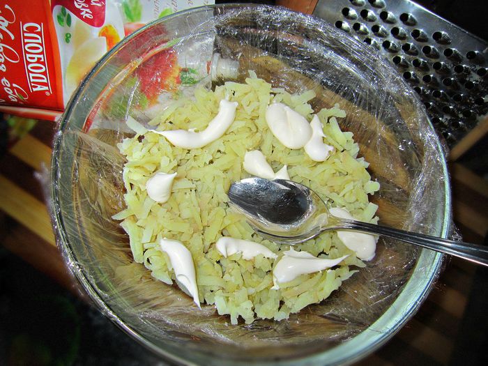 Затем, чистим и натираем на крупной тёрке картофель. Выкладываем поверх грибов и смазываем майонезом.