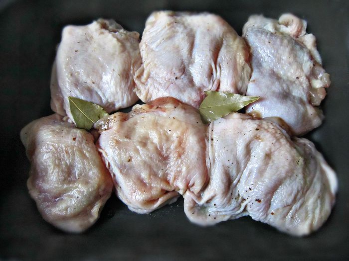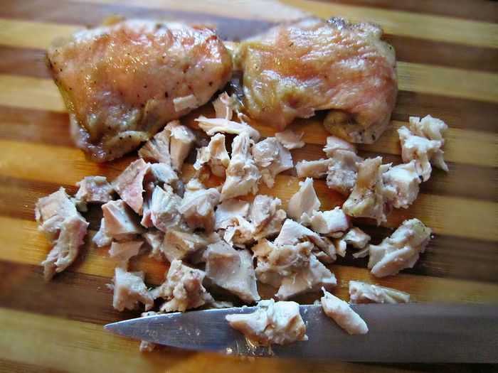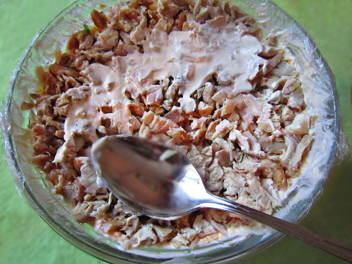 Последним выкладываем слой нарезанной курочки, также слегка смазанный майонезом. Накрываем пищевой плёнкой и даём постоять в холодильнике не менее 2 часов.
