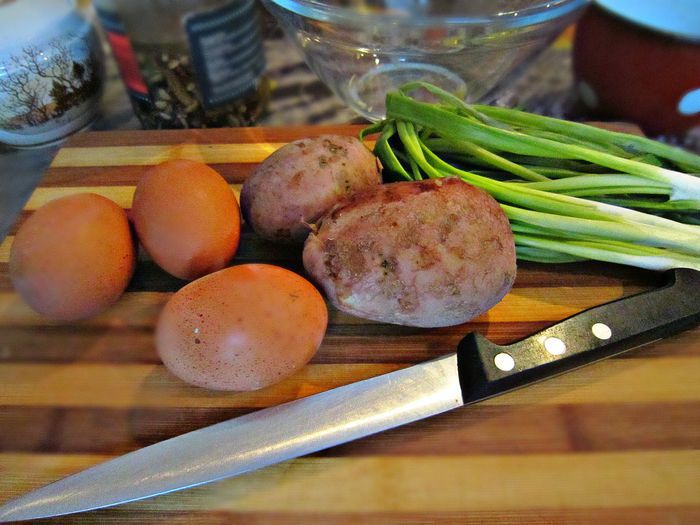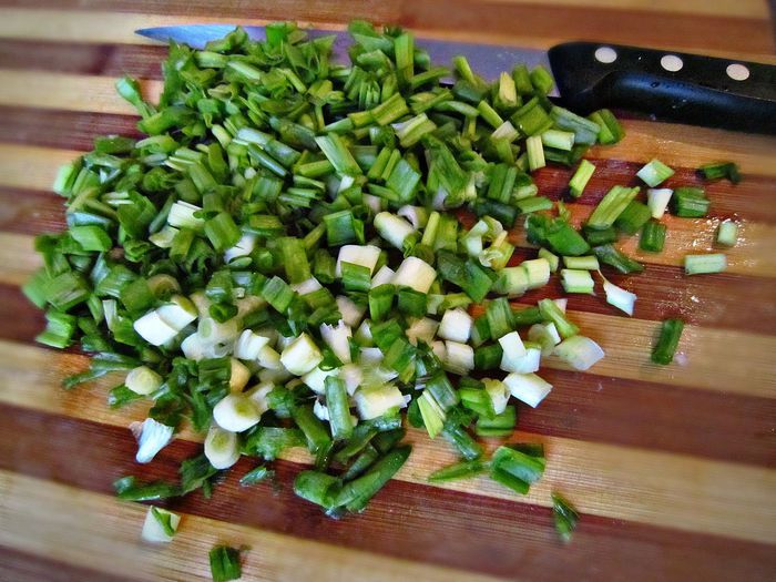 Далее - моем, обсушиваем и нарезаем мелко зелёный лук. Выкладываем следующим слоем, слегка подсаливаем и смазываем майонезом.