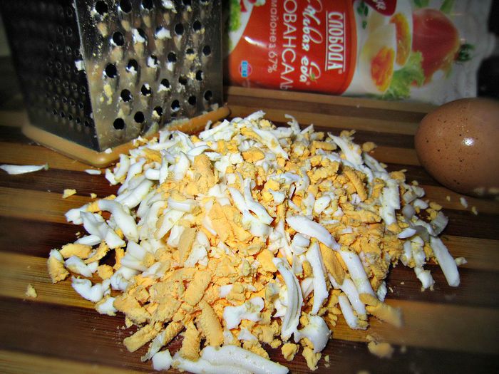 Яйца чистим, натираем на крупной тёрке и выкладываем поверх лука. Смазываем немного майонезом.