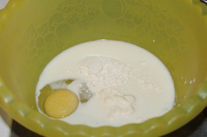В чашку налить молока, добавить яйцо, майонез, муку.