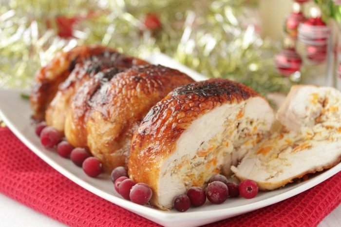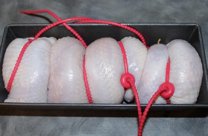 Выкладываем наши блинчики на тушку курицы и аккуратно сворачиваем в рулет.
