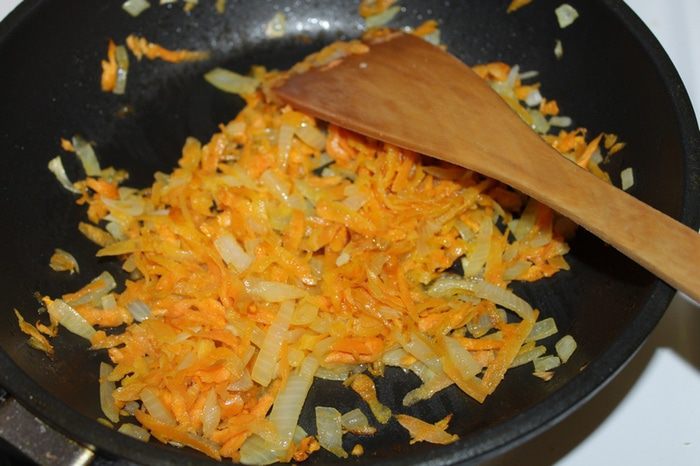 Морковь натереть, лук порезать, пассировать все на растительном масле.