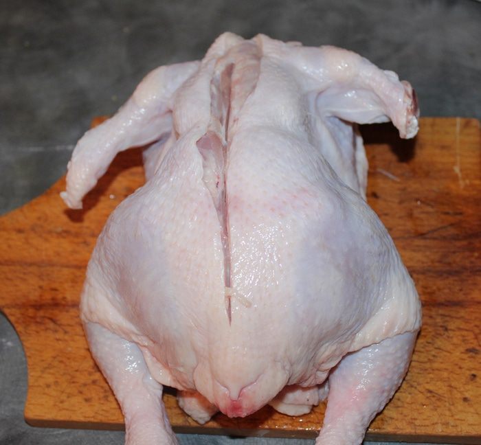 Нужно отделить мясо курицы от скелета. Курицу разрезаем по спинке. Отрезаем попку, крылья в суставах.