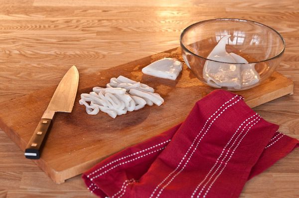 Очищенное филе кальмара нарезать кольцами.