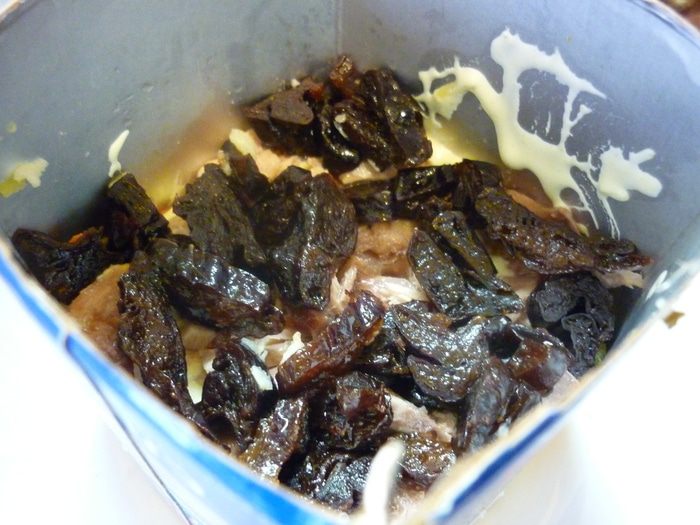 А теперь мясо и чернослив.Яблочко натрем на мелкой терке. Посоусим.Сыр. Укроп мелко порубим и припорошим.