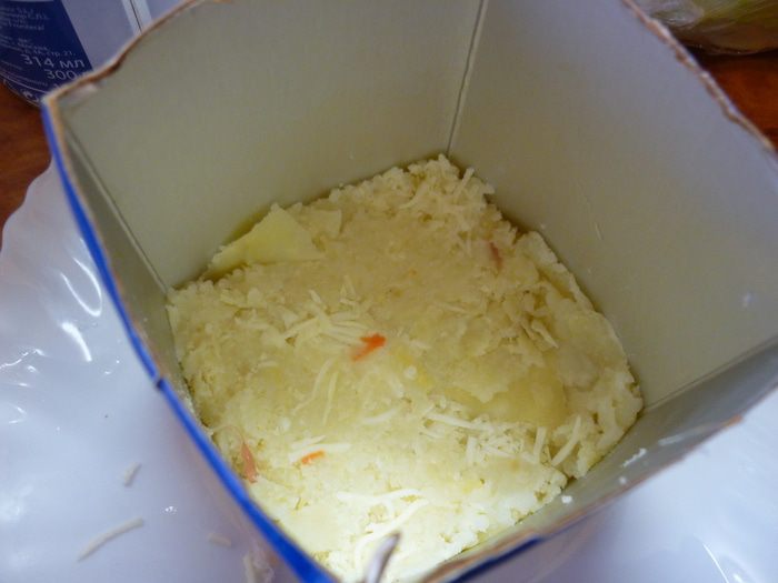 В качестве сервировочного кольца - коробка от сливок. Картошечку натереть, утрамбовать на донышко, полить соусом, положить лучок и немного сыра, и снова соус.