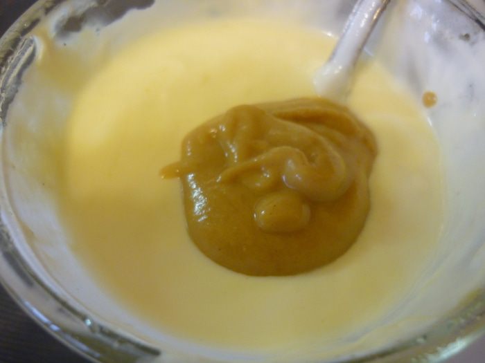 Майонез смешиваем с горчицей. Вот тут то и проявится сила духа))))
