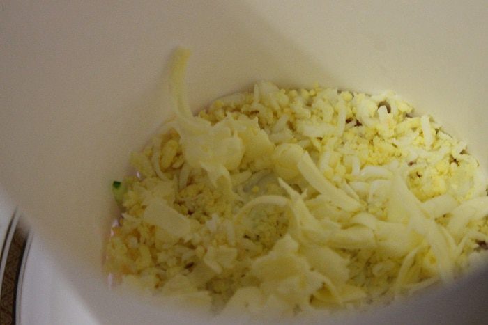 Яйцо отвариваем, трем на мелкой терке, выкладываем сверху, и добавляем поверх яйца сливочное масло потертое на крупной терке.