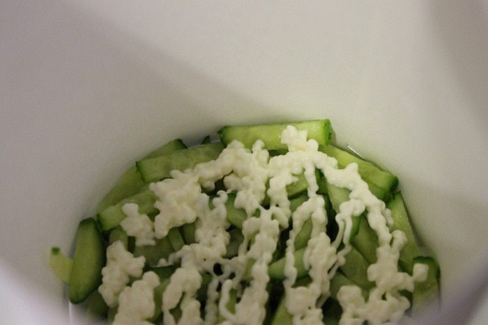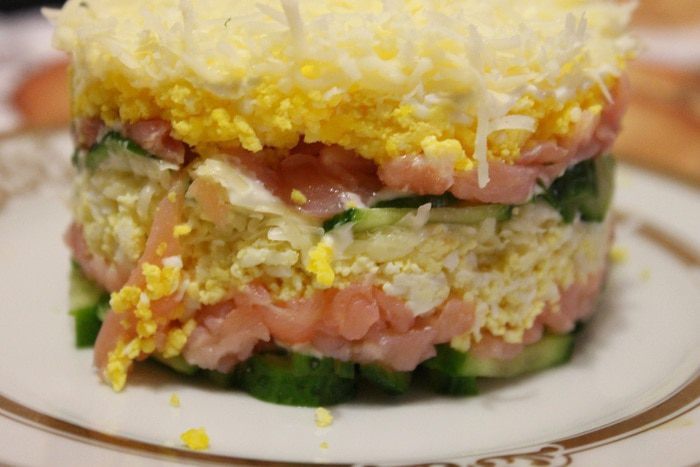 Сервировочное кольцо ставим на тарелку, выкладываем в него огурец порезанный соломкой, хорошо его утрамбовываем, смазываем сеточкой майонеза.