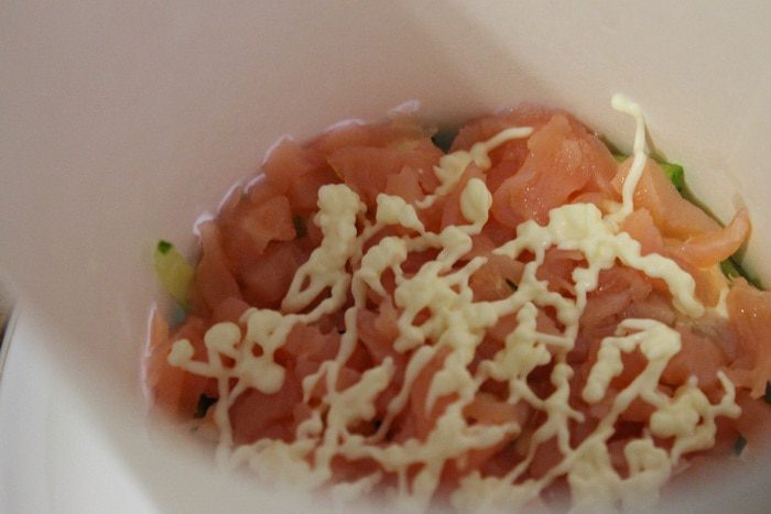 Сверху кладем семгу порезанную тонкими полосками и опять майонез.