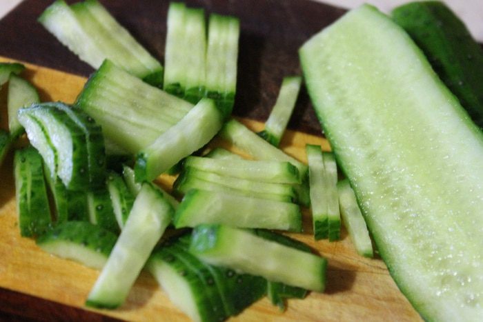 Огурец режем пластинками, а потом мелкой соломкой.