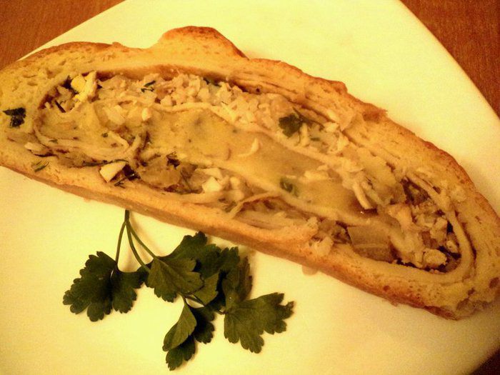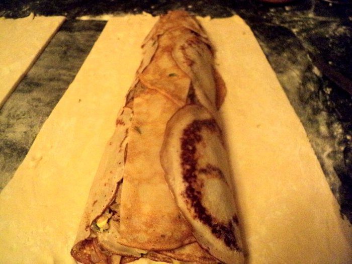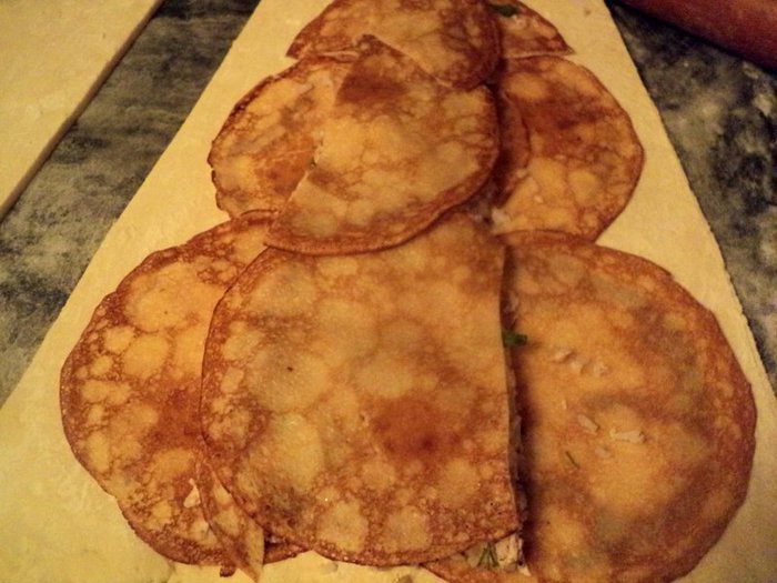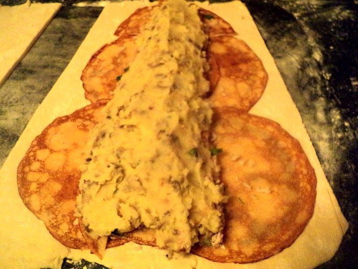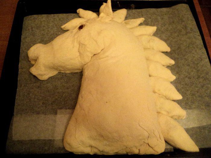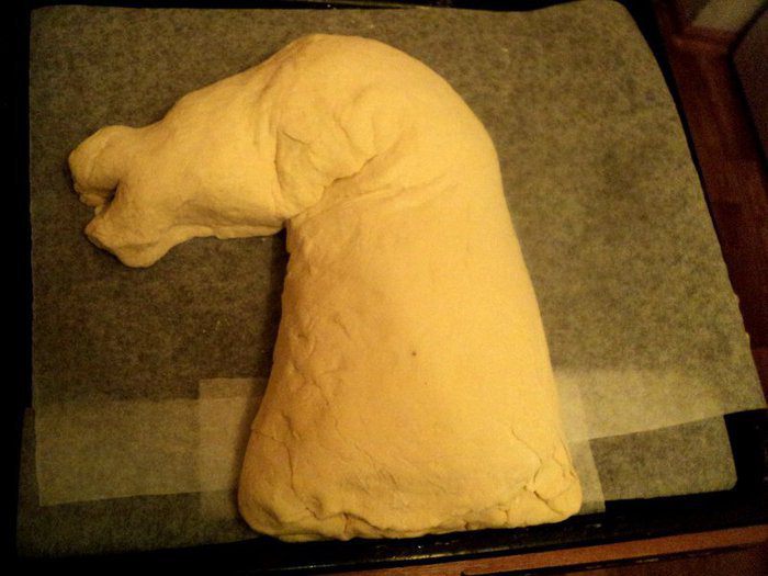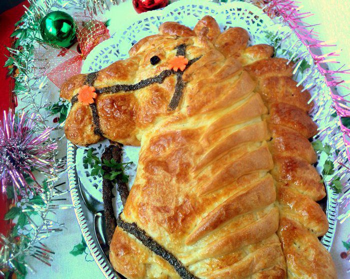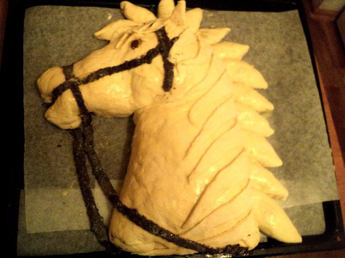 Пельменное тесто раскатать в пласт толщиной 2 мм, посыпать маком, прикатать скалкой и вырезать детали сбруи и уздечки. После расстойки пирога еще раз поправить тесто, формируя голову лошади. Смазать пирог взбитым яйцом. Наложить полоски из пельменного теста в виде уздечки. Выпекать в духовке при температуре 180 градусов 45 минут. Если верх начнет слишком румяниться, накрыть фольгой.