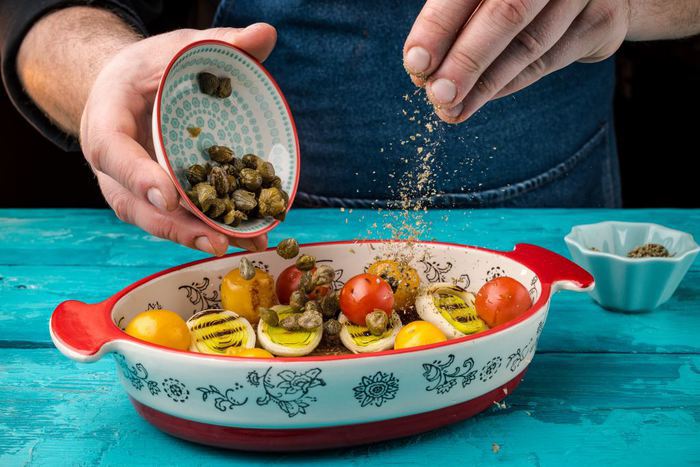 На сковороде-гриль обжариваем помидоры черри и нарезанный лук порей. Кладем рядом со стейком помидоры с луком, добавляем каперсы. Посыпаем майораном.
