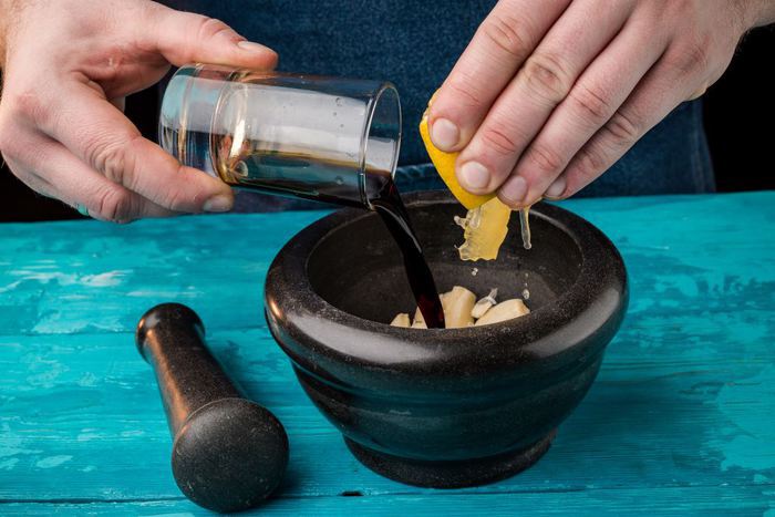 Готовим маринад. Смешиваем соевый соус, лимонный сок, белый перец и чеснок.