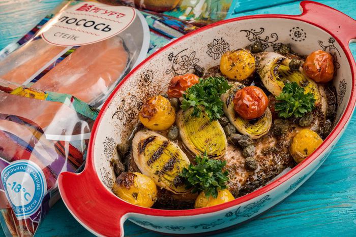 Готовим стейк лосося, запеченный с помидорами черри!