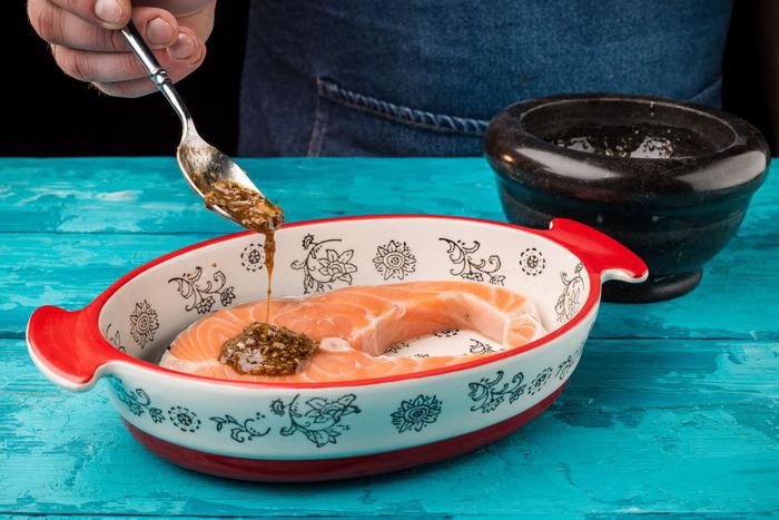 Стейк лосося ТМ «Магуро» размораживаем и моем. Разогреваем духовку до 220°С. Форму для запекания смазываем оливковым маслом, выкладываем рыбу.