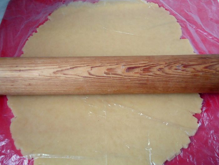 Для удобства приготовления тесто разделить на две части. Одну часть прикрыть пленкой, а из другой части теста раскатать пласт в 4-5 мм толщиной между двумя слоями пленки.