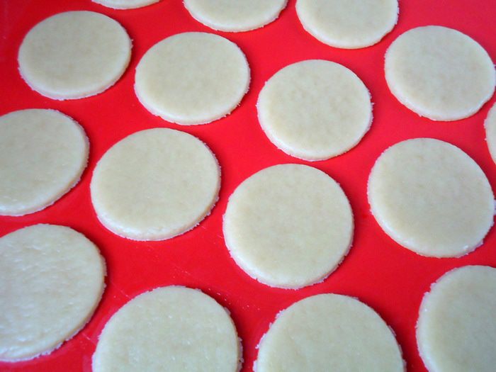 Круглой выемкой d 6-8 см вырезать заготовки для печенья. Аккуратно перенести заготовки на противень. Выпекать в заранее разогретой духовке при 180 гр. 20 минут.