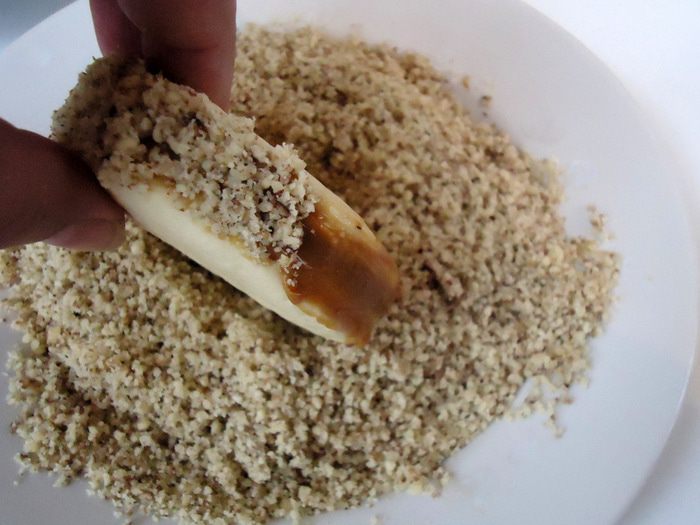 обмакнуть в измельченных грецких орехах.
