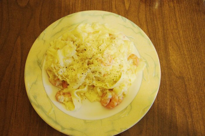 Туда же выложите половину количества тертого сыра и приготовленные креветки.