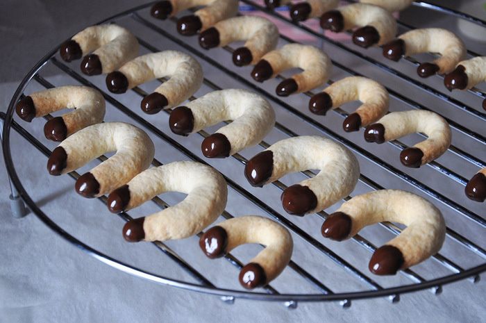 Мягкое масло взбить с сахаром (делаю в комбайне), добавить яйцо и просеять туда муку с разрыхлителем. Взбить (должно скататься в шарик) и в хол-к минут на 40-50. Отщипывать кусочки и катать колбаски, скручивать в форму подковы. Печь около 15-20 минут при 180 гр.