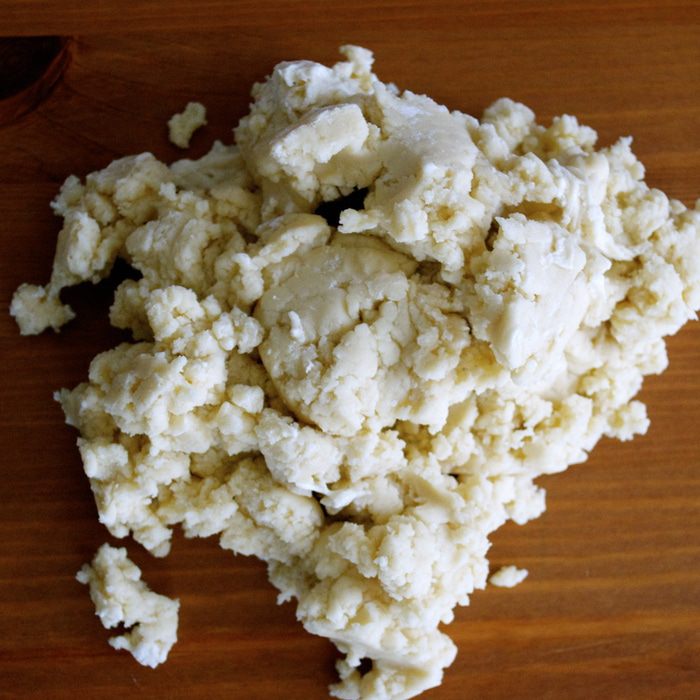 Замесить тесто, положив в чашу блендера муку, жир и 6-7 ст.л. холодной воды. Можно сделать это и вручную, порубив муку с жиром, и затем, добавляя воду, замесить тесто. Собрать в шар.