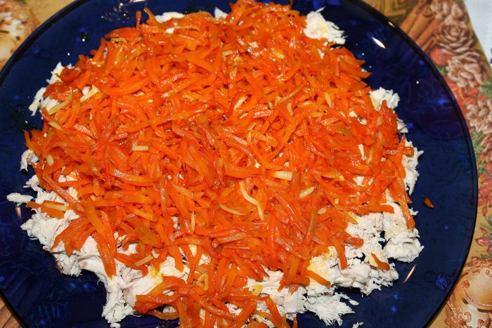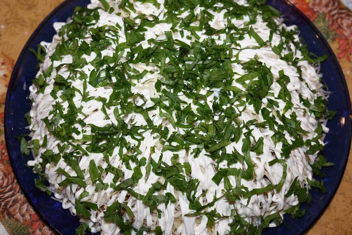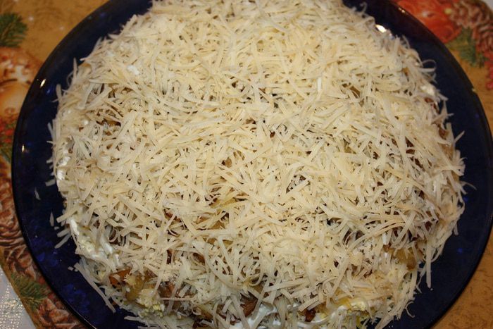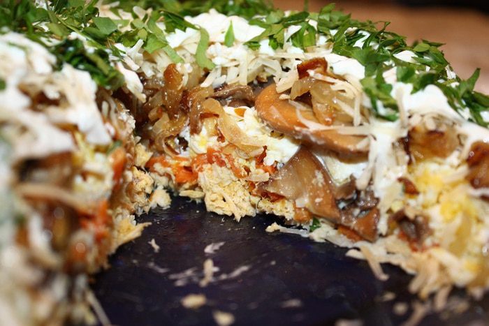 Яйца сварить, натереть на мелкой терке и выложить следующим слоем. Посолить и поперчить. Грибы нарезать и обжарить на растительном масле до золотистого цвета и выложить на яйца. Лук нарезать полукольцами и обжарить на растительном масле до золотистого цвета и выложить на грибы.