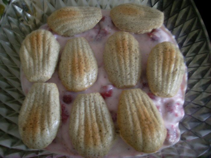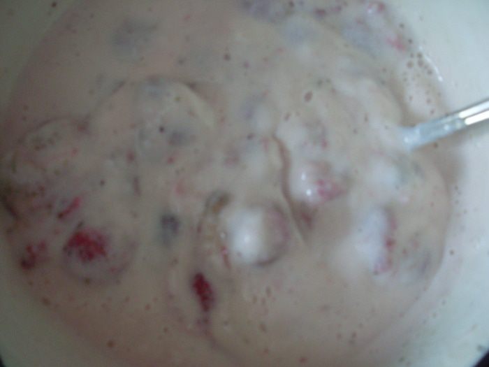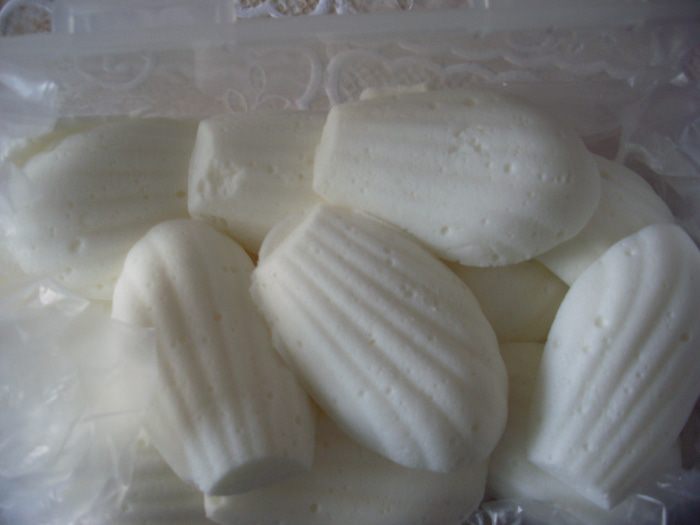 Сделать облака. Растолочь 6 таблеток заменителя сахара в мелкий порошок. Высыпать его в 250-граммовый стакан. Залить 50 граммами кипятка. Подождать пока растворится полностью. Добавить холодное молоко до верха стакана. Залить этой местью 15 грамм желатина и дать постоять 10 минут (если желатин хороший, иностранного производства, то должно хватить и 10 грамм желатина - у них пачки по 10 грамм, а у меня русский и как раз 15 грамм то что надо). Нагреть смесь до полного растворения желатина, но не допускать кипения. Оставить смесь остывать (я остужаю на балконе 5-10 минут), желатин должен чуть-чуть начать густеть, но еще не стать желе (если передержали, надо немного подогреть помешивая до этого состояния). После этого в глубокой посуде электрическим миксером взбиваю эту массу - желатин начинает схватываться и получается густая пена, как сливки взбитые до мягких пиков. Раскладываю столовой ложкой в формочки для мадлен и ставлю застывать на балкон на 10 минут - если в холодильнике то дольше. Достаю получившиеся облака и храню в герметичном контейнере в холодильнике. Всего получилось 18 облачков и еще на пару-тройку штук осталось. На торт потребовалось около 15 шт.