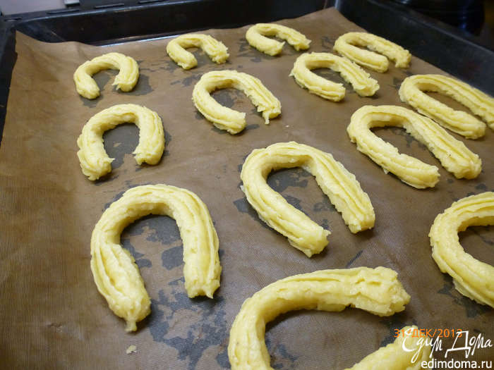 Духовку разогреваем до 200С. С помощью кондитерского мешка на противень отсаживаем подковы (примерно по 5 см в длину). Выпекаем 10-15 минут до светло-золотистого цвета. Готовые подковы оставляем на противне до полного охлаждения.