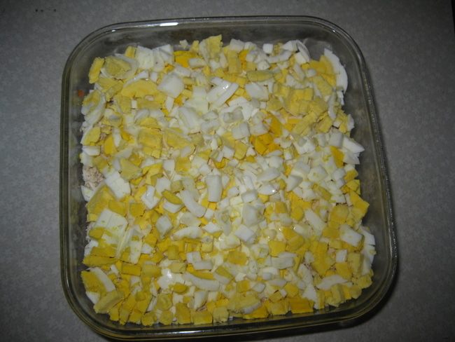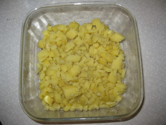 На дно выкладываем тонким слоем оливковый майонез "Слобода". Чистим отварной картофель в мундире. Режим его квадритиками и выкладываем 1-й слой.