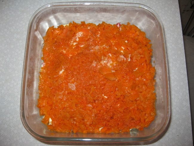 2-й слой: измельчаем вареную морковку.