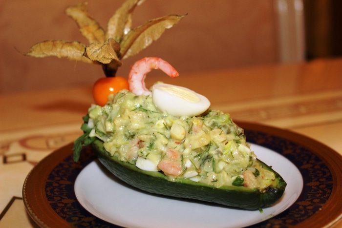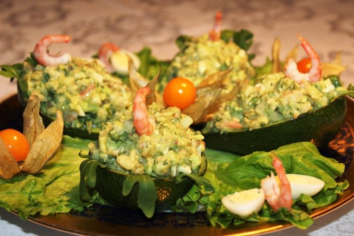 Лодочки из авокадо выложить на листовой салат и наполнить их начинкой. Украсить физалисом, креветками и половинками перепелиных яиц.