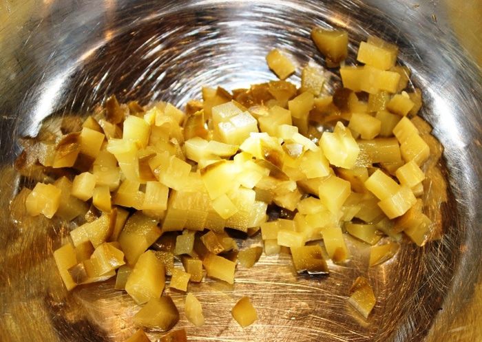 Огурец нарезать на мелкие кубики.