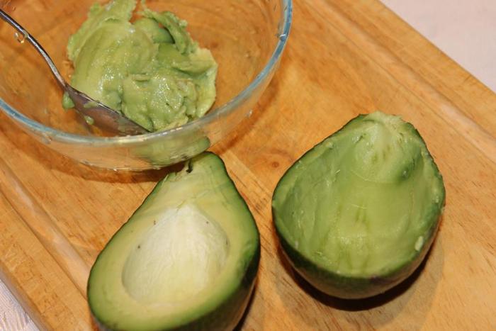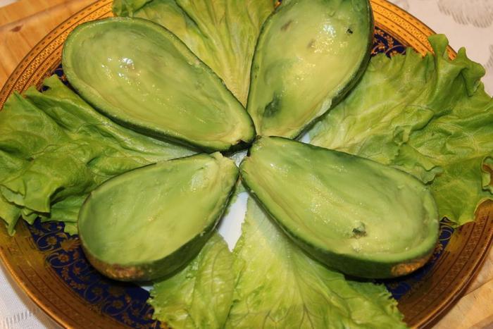 Авокадо разделить пополам, убрать косточку. Чайной ложкой вынуть мякоть. Должны получиться аккуратные лодочки из кожуры авокадо... сразу необходимо смазать их свежевыжатым соком лимона, чтобы не потемнели. Мякоть авокадо также сбрызнуть соком лимона.